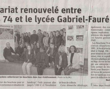 Article du Dauphiné Libéré en date du : 29/01/2023 ; ANNECY : Le partenariat renouvelé entre Bouchons 74 et le lycée Gabril-Fauré