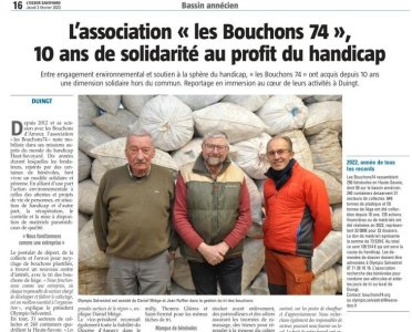 Article de l’ESSOR SAVOYARD en date du : 02/02/2023 ; BASSIN ANNECIEN : L’association Les Bouchons 74, 10 ans de solidarité au profit du Handicap