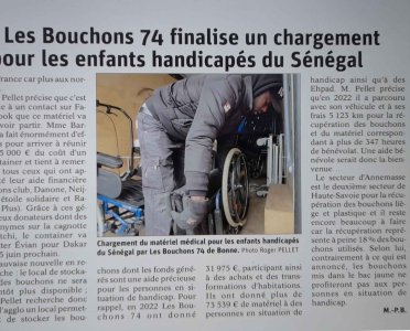 Article du Dauphiné Libéré en date du : 31/01/2023 ; BONNE : L’association Les Bouchons 74 finalise un chargement de matériel pour les enfants handicapés du Sénégal