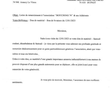 L’ergothérapeute d’une personne en situation de handicap de THONON-LES-BAINS, nous remercie pour l’aide que nous apportons à sa patiente. (…)
