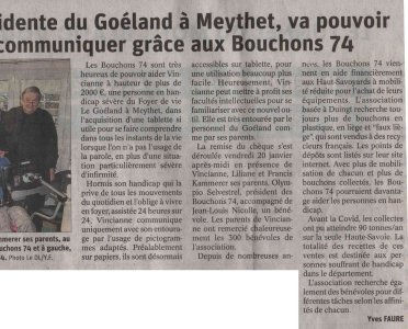 Article du Dauphiné Libéré en date du : 22/01/2023 ; ANNECY : Vincianne, résidente du Goéland à Meythet, va pouvoir encore mieux communiquer grâce aux Bouchons 74