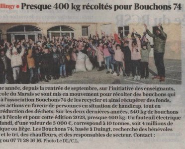 Article du Dauphiné Libéré en date du : 20/12/2023 ; La Balme de Sillingy ; Presque 400 kg récoltés pour Bouchons 74