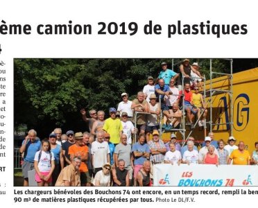 Article du Dauphiné Libéré en date du : 02/07/2019 ; DUINGT ; chargement du 3ème camion 2019 de plastiques pour les Bouchons 74