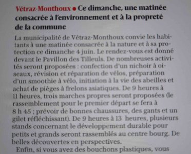 Article du Dauphiné Libéré en date du : 04/06/2023 ; VÉTRAZ-MONTHOUX ; Ce dimanche, une matinée consacrée à l’environnement et à la propreté de la commune
