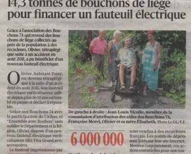 Article du Dauphiné Libéré en date du : 13/07/2023 ; Poisy ; 14,3 tonnes de bouchons de liège pour financer un fauteuil électrique