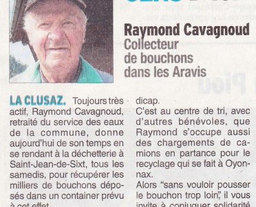 Articlez du Dauphiné Libéré en date du 27/05/2015 ; LA CLUSAZ : Raymond CAVAGNOUD, collecteur de bouchons dans LES ARAVIS
