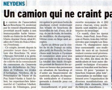 Raymond, un de nos fidèles collecteurs de bouchons Raymond est dans le journal du Dauphiné Libéré du 27 mai 2015. Depuis pas mal d’année, (…)