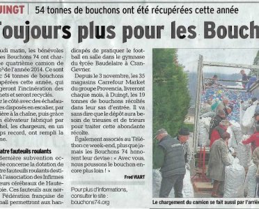 Article du Dauphiné Libéré en date du : 08/12/2014 ; DUINGT, 54 tonnes de bouchons ont été récupérées cette année. Toujours plus pour les Bouchons 74