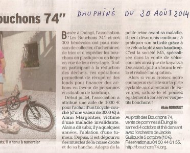 Article du Dauphiné Libéré en date du : 20/08/2014 ; MARLENS, une bonne action des Bouchons 74