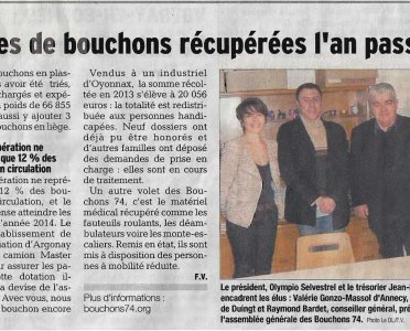 Article du Dauphiné Libéré en date du : 01/02/2014 ; FAVERGES, retombées solidaires des Bouchons 74