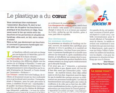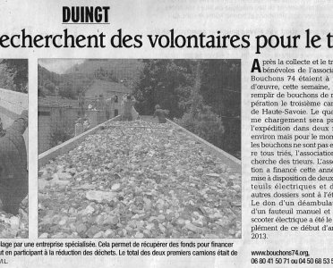 Article du Dauphiné Libéré en date du : 14 juin 2013 ; Les Bouchons 74 recherchent des volontaires pour le tri