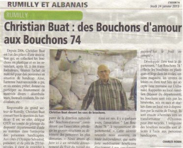 Article de l’Essor savoyard en date du : 24 janvier 2013 ; Christian BUAT, des Bouchons d’Amour aux Bouchons 74