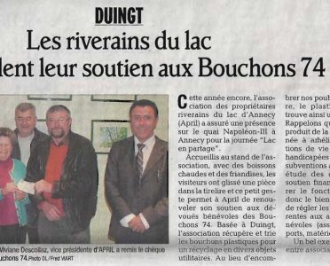Article du Dauphiné Libéré en date du : 28 novembre 2012 ; Les riverains du lac renouvellent leur soutien aux Bouchons 74