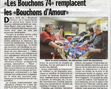 Article de l’Hebdo des Savoie en date du : 24 janvier 2013 ; Les Bouchons 74 remplacent les Bouchons d’Amour