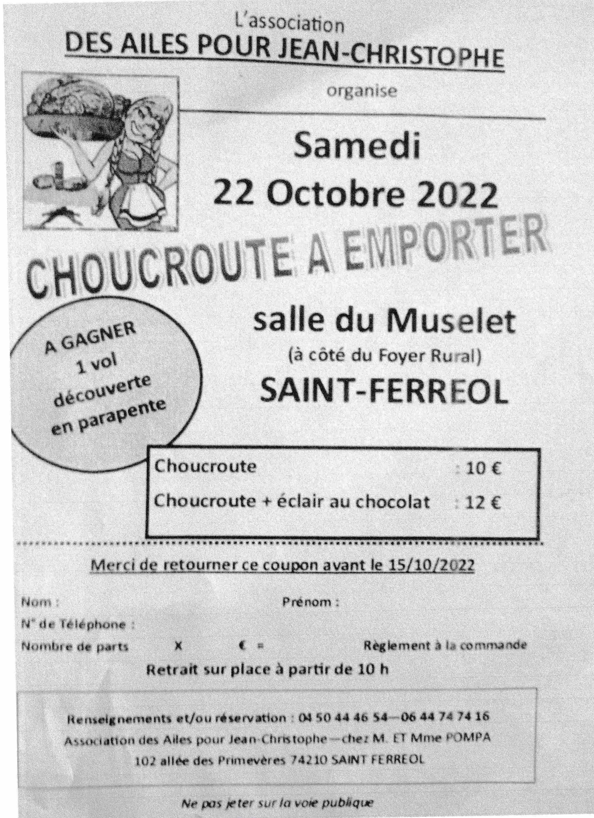 L’association des AILES POUR JEAN CHRISTOPHE organise une vente de choucroute à emporter.