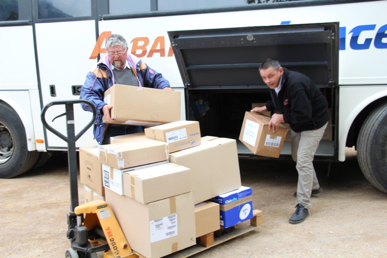 Les bénévoles de l’Albanais sont venus en force, menés par le responsable de ce secteur Christian pour prêter main forte au déchargement (soutes du car et remorque pleines).