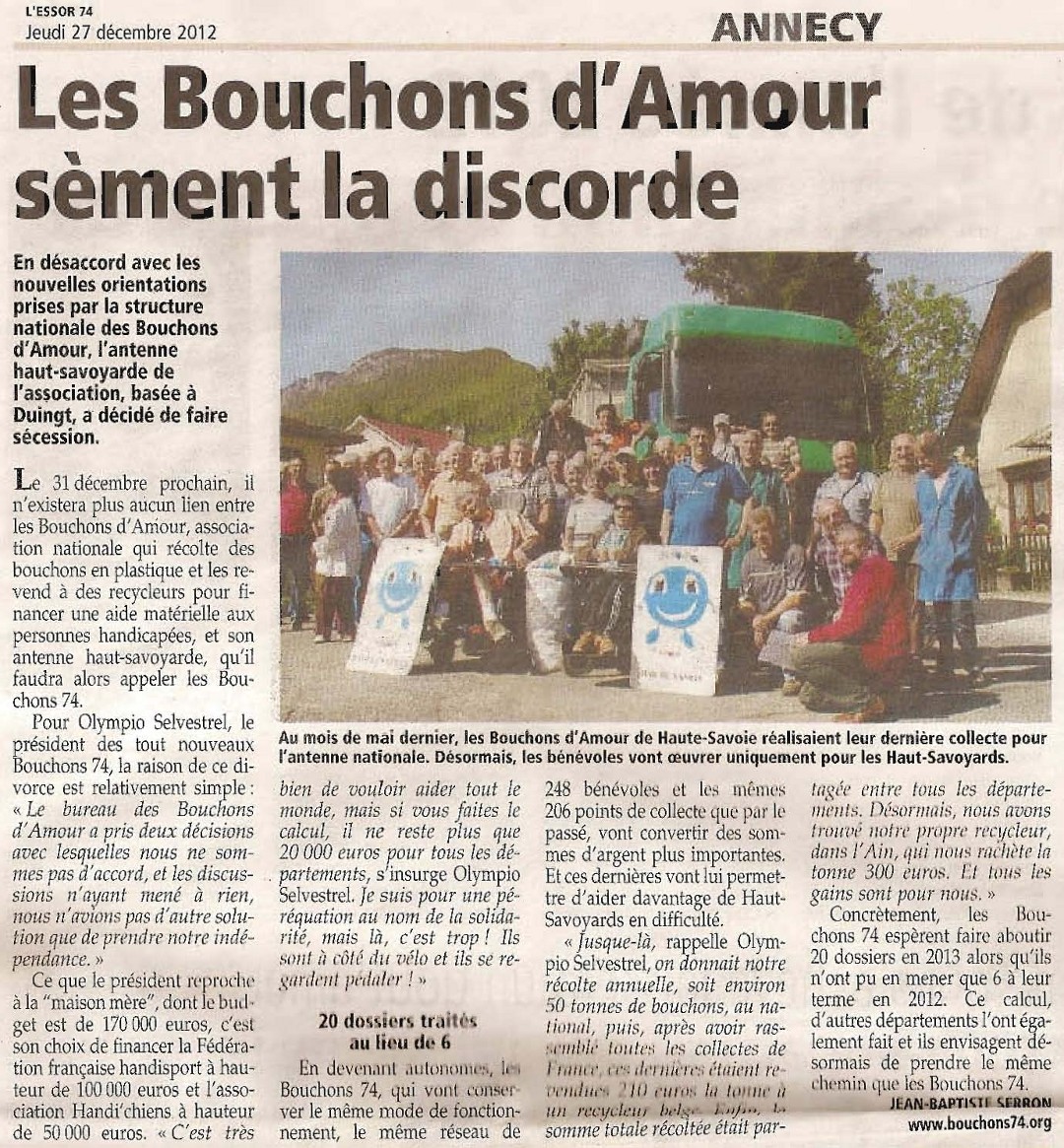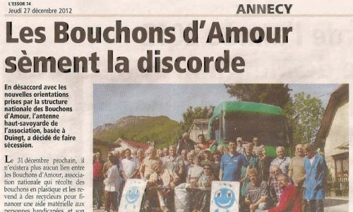 Article de l’Essor savoyard en date du : 27 décembre 2012 ; Les Bouchons d’Amour sèment la discorde