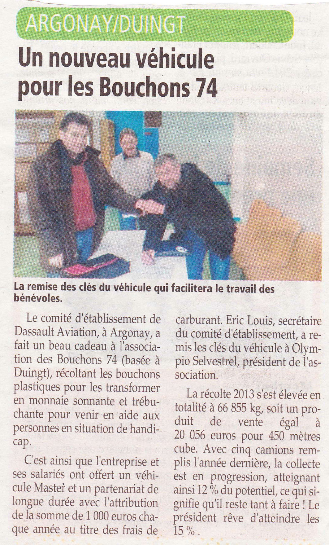 Article de l’Essor Savoyard en date du : 30/01/2014 ; Un nouveau véhicule pour les Bouchons 74