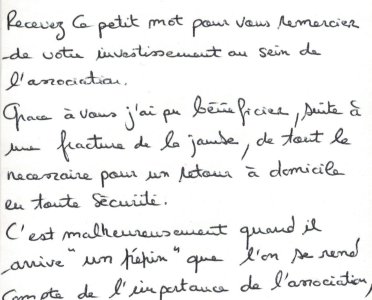 Merci à Sylvain, pour ce mot qui motive nos bénévoles. Nous lui souhaitons un bon rétablissement. Cliquez sur le document, pour l’agrandir.