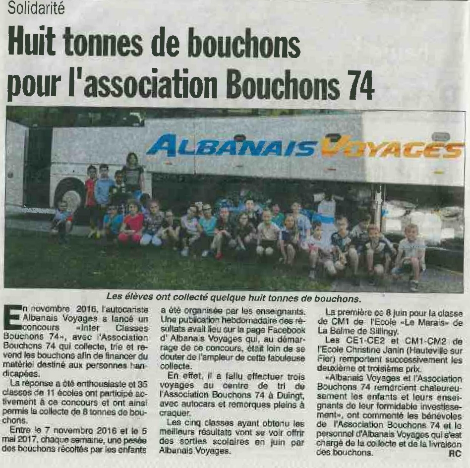 Article de l’Hebdo des Savoie 08-06-2017 ; Solidarité : Huits tonnes de bouchons pour l’association Bouchons 74