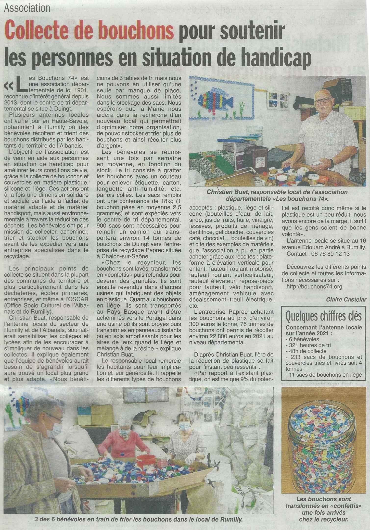 Article de l’Hebdo des Savoie du 16/06/2022 : Association : Collecte de bouchons pour soutenir les personnes en situation de handicap