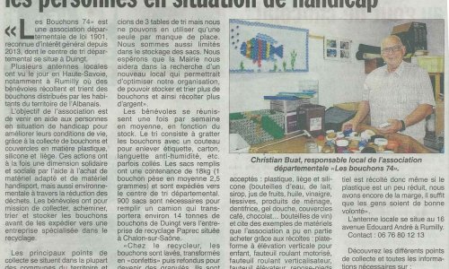 Article du Dauphiné Libéré en date du : 08/04/2020 ; DUINGT, Les Bouchons 74 continuent d’aider les personnes handicapées