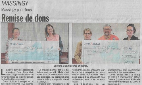 Article de l’Hebdo des Savoie en date du : 09/05/2024 ; Massingy ; Massingy pour tous, Remise de dons