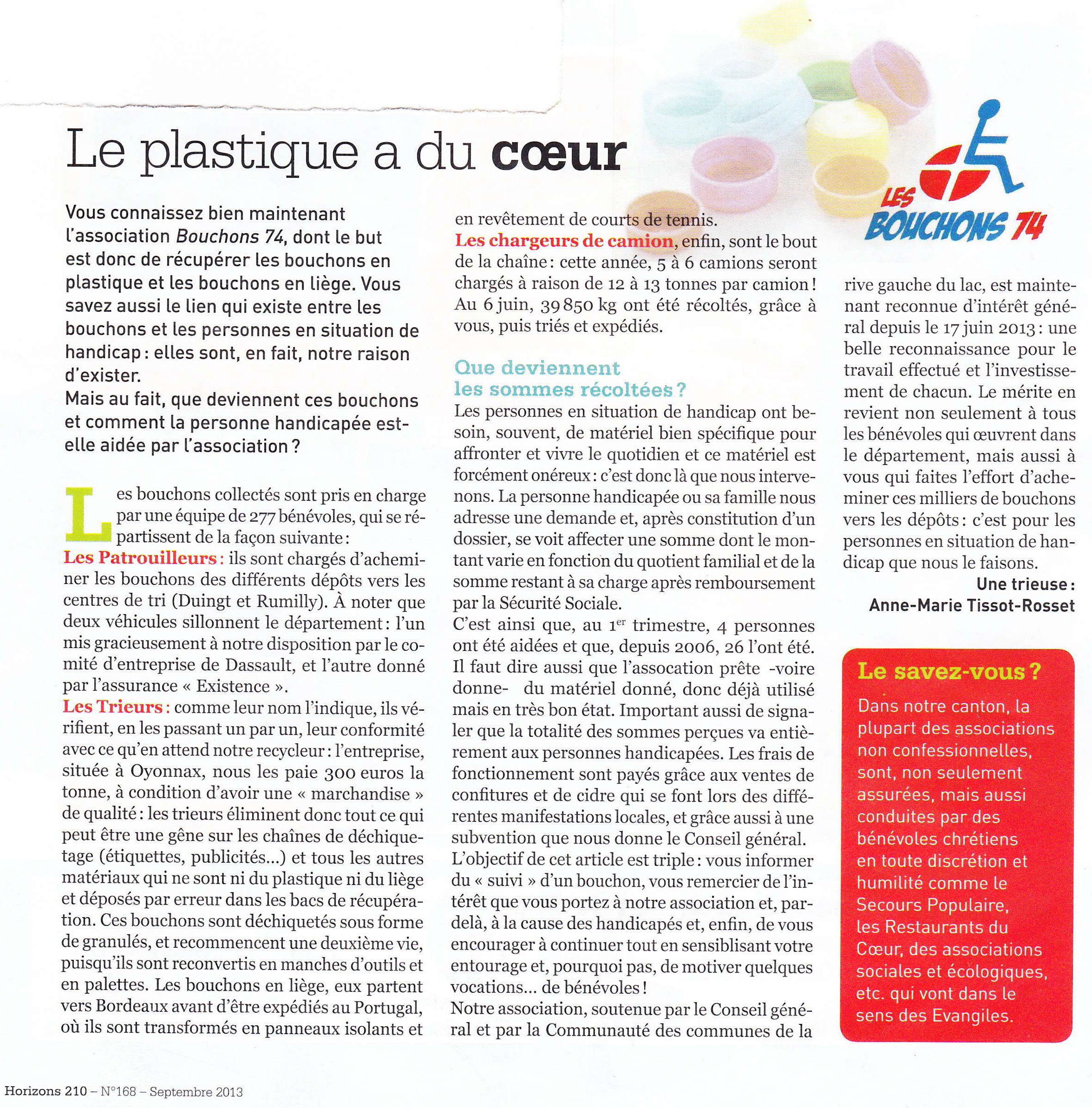 Article de la revue Horizon 210 N°168 septembre 2013 ; Le plastique a du coeur
