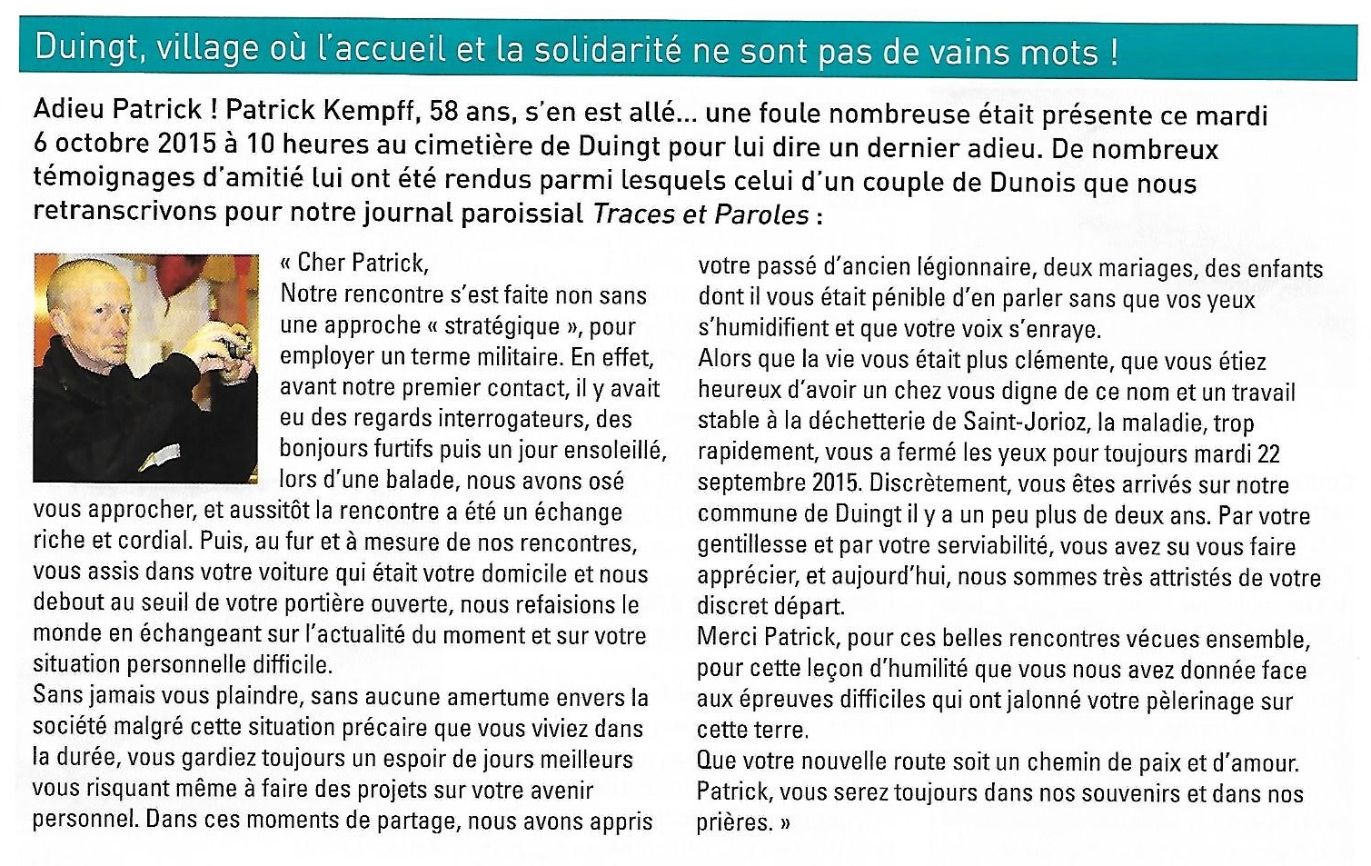 Article de la revue Traces et paroles décembre 2015 ; DUINGT village où l’accueil et la solidarité ne sont pas de vains mots !
