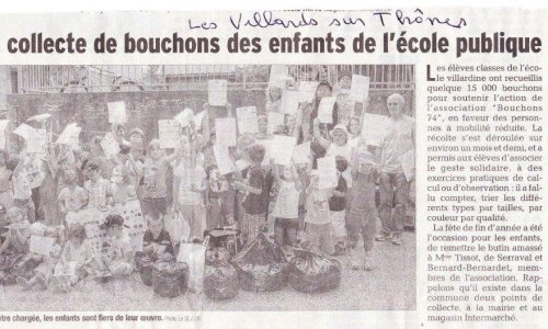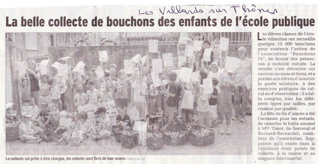 Article du Dauphiné Libéré de juillet 2014 ; VILLARDS-SUR-THÔNES, La belle collecte de bouchon des enfants de l’école publique