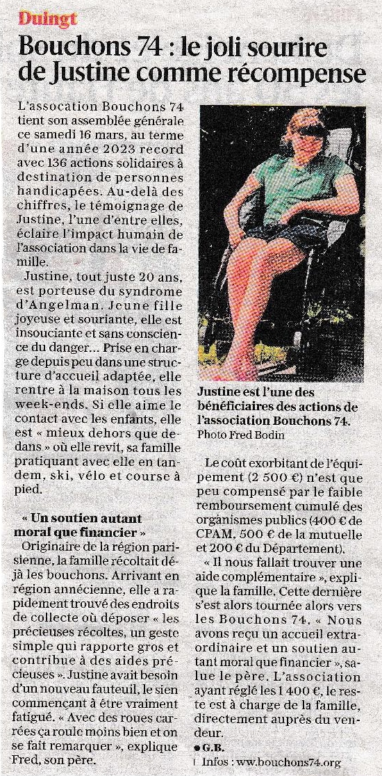 Article du Dauphiné Libéré en date du : 16/03/2024 ; Duingt ; Bouchons 74 : le joli sourire de Justine comme récompense