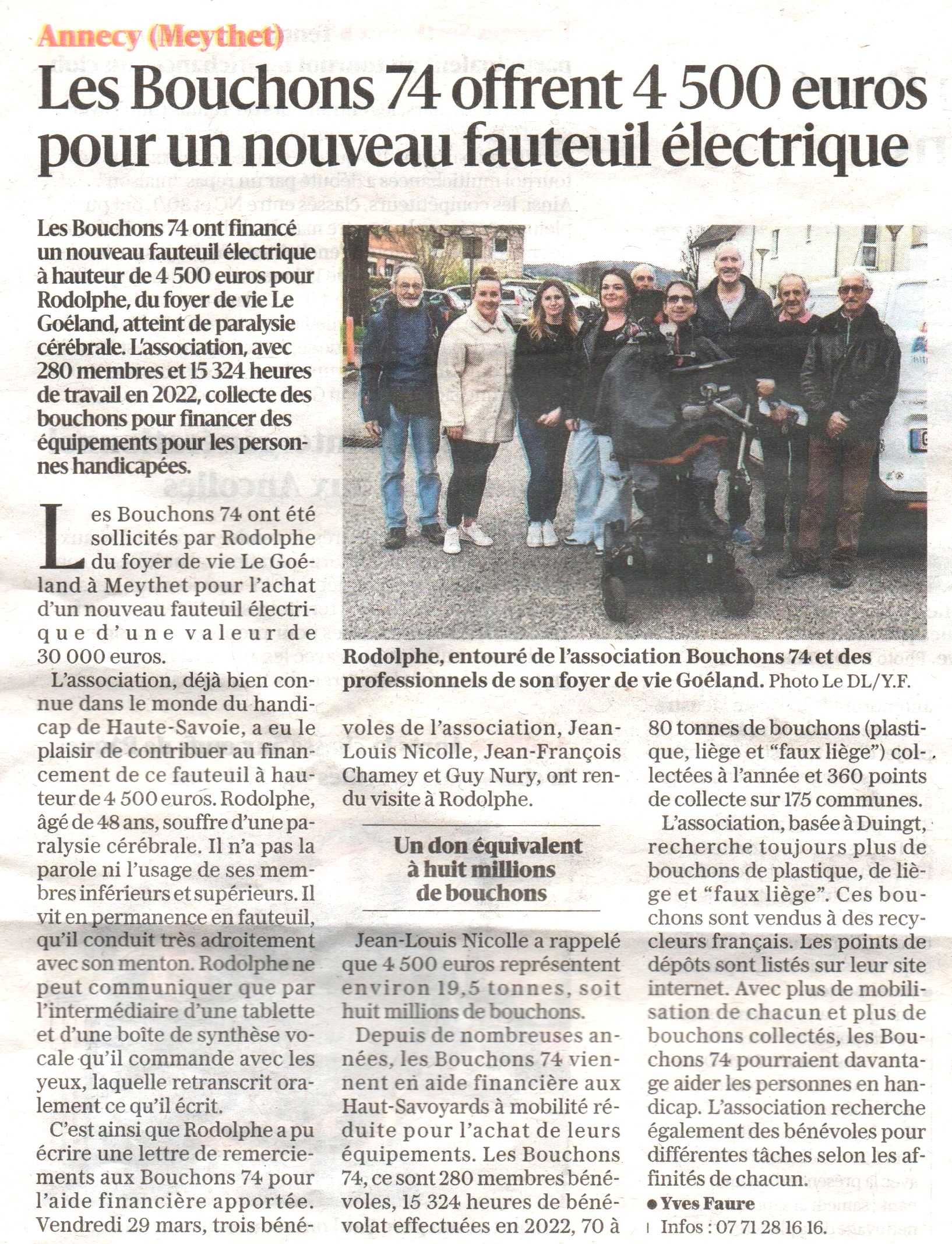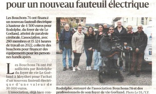 Article du Dauphiné Libéré en date du : 02/04/2024 ; Annecy-Meythet ; Les Bouchons 74 offrent 4 500 euros pour un nouveau fauteuil électrique