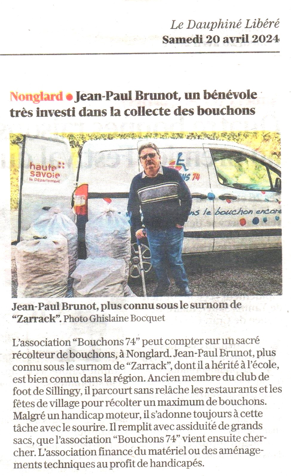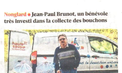 Article du Dauphiné Libéré en date du : 20/04/2024 ; Nonglard ; Jean-Paul BRUNOT, un bénévole très investi dans la collecte des bouchons