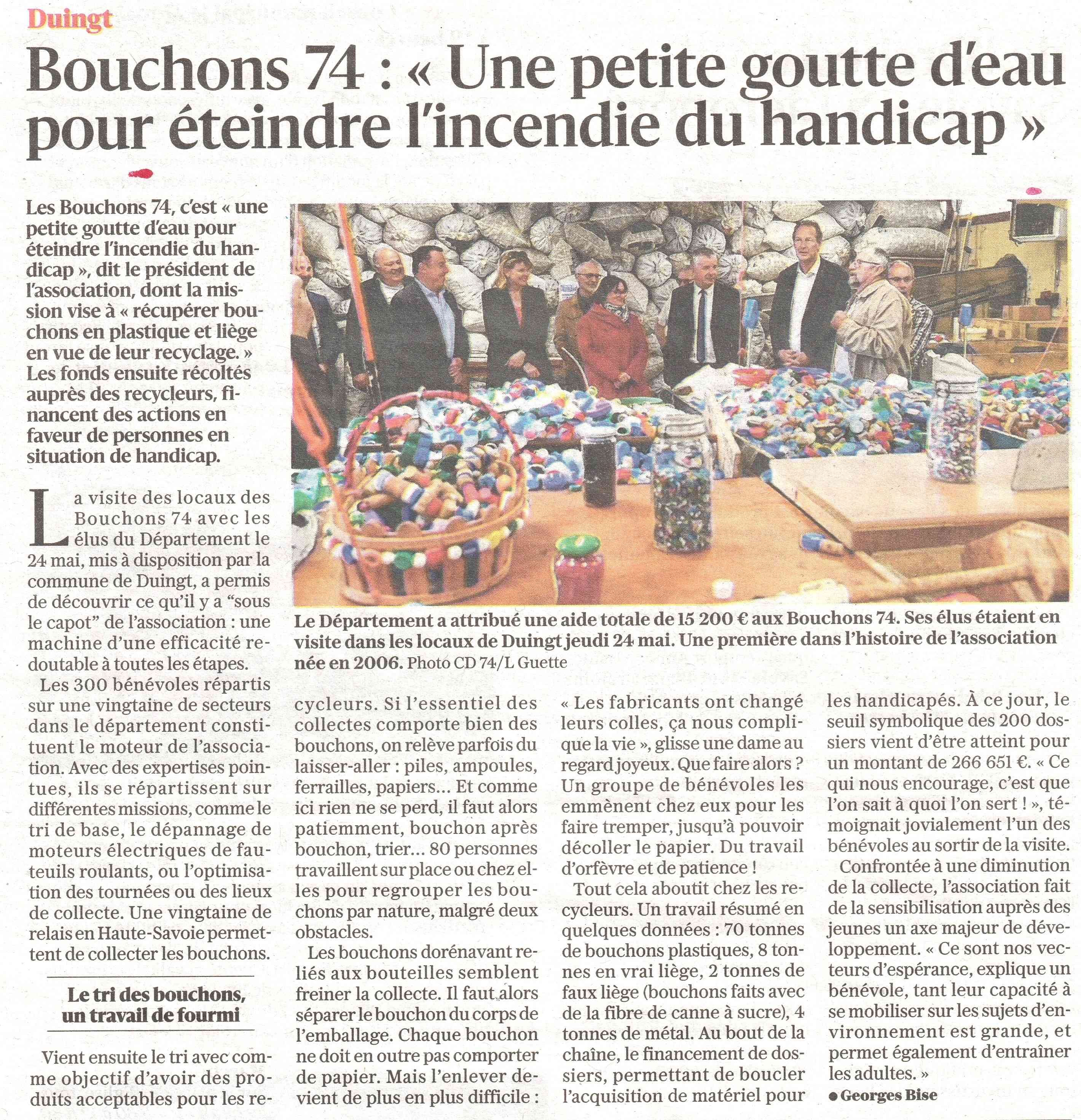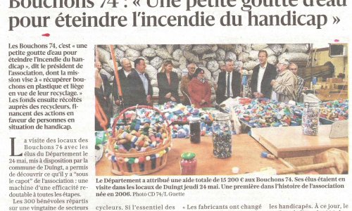 Article du Dauphiné Libéré en date du : 26/05/2024 ; DUINGT ; Bouchons 74 : <<Une petite goutte d'eau pour éteindre l'incendie du handicap>>