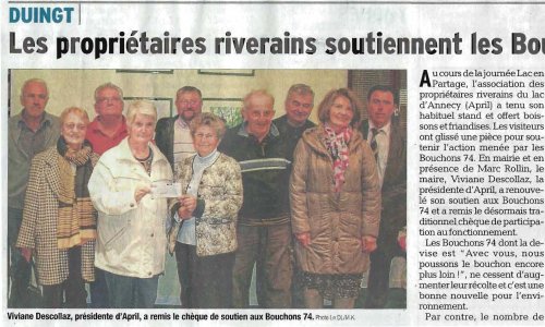 Article du Dauphiné Libéré en date du : 29/10/2014 ; DUINGT, les propriétaires riverains soutiennent les Bouchons 74