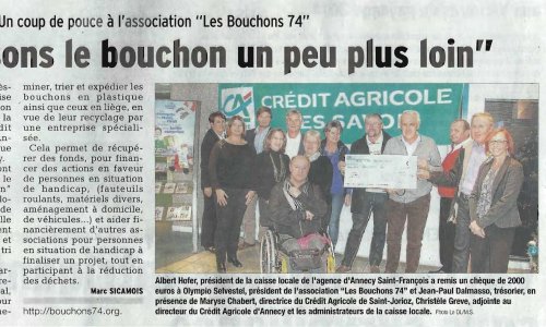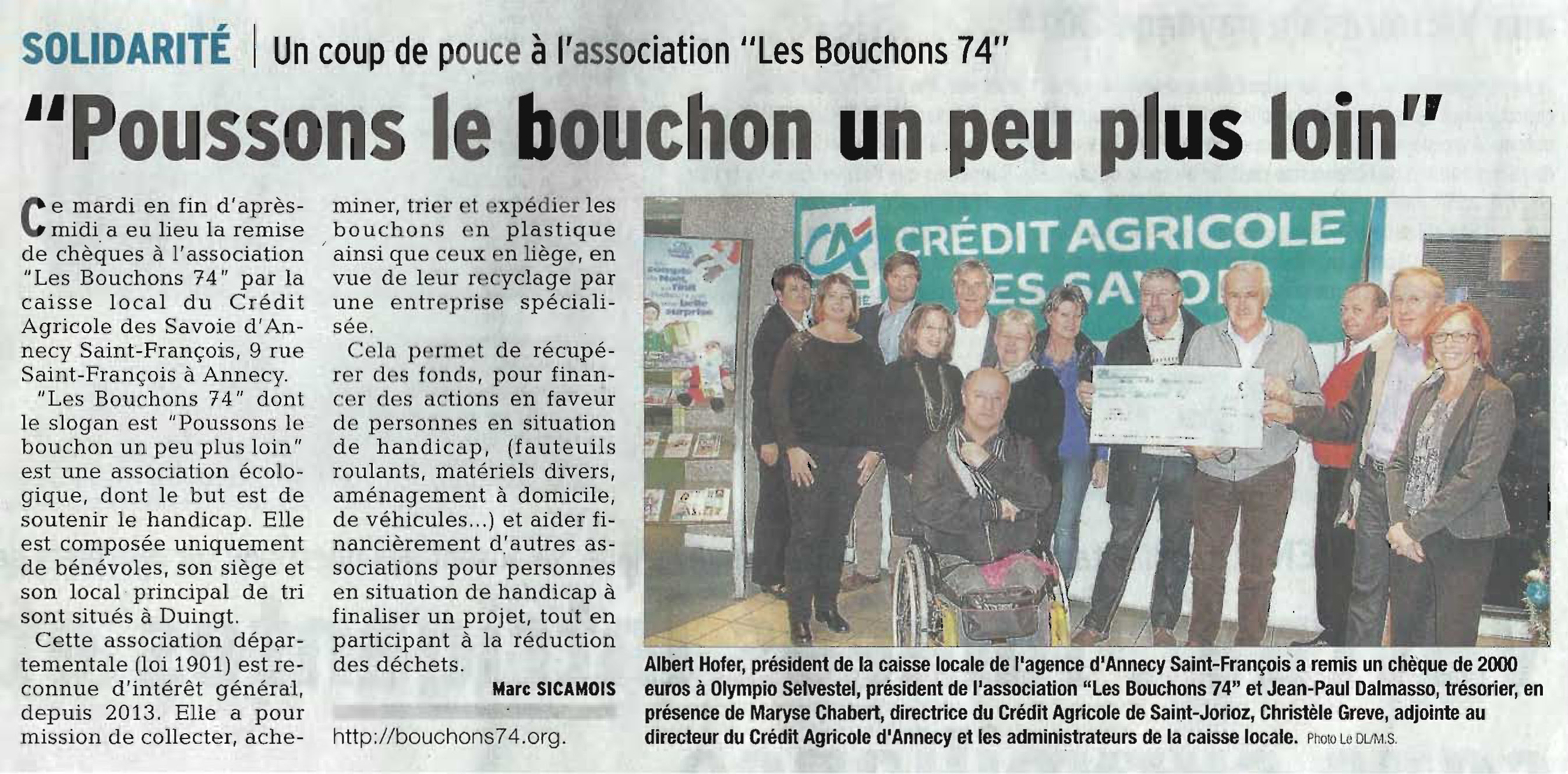 Article du Dauphiné Libéré en date du : 13/12/2014 ; Crédit Agricole, un coup de pouce à l’association les Bouchons 74
