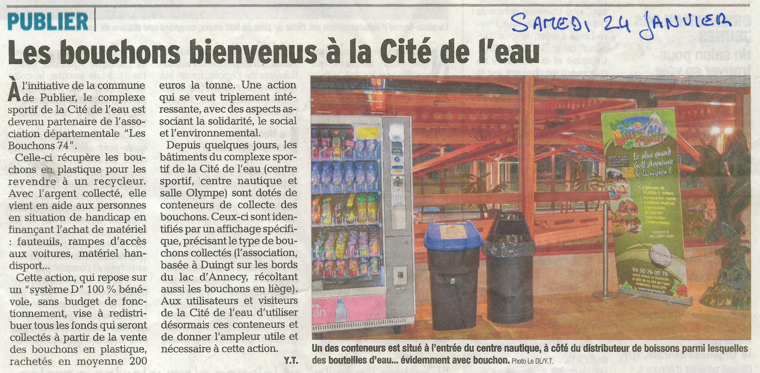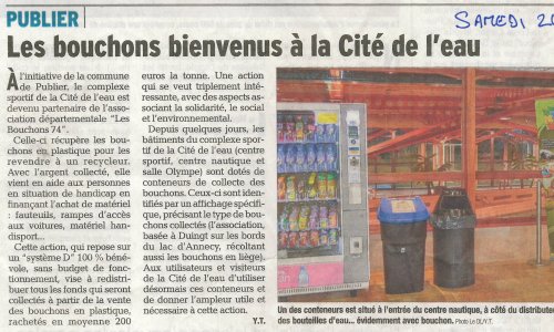 Article du Dauphiné Libéré en date du : 24/01/2015 ; PUBLIER, Les bouchons bienvenus à la Cité de l’eau