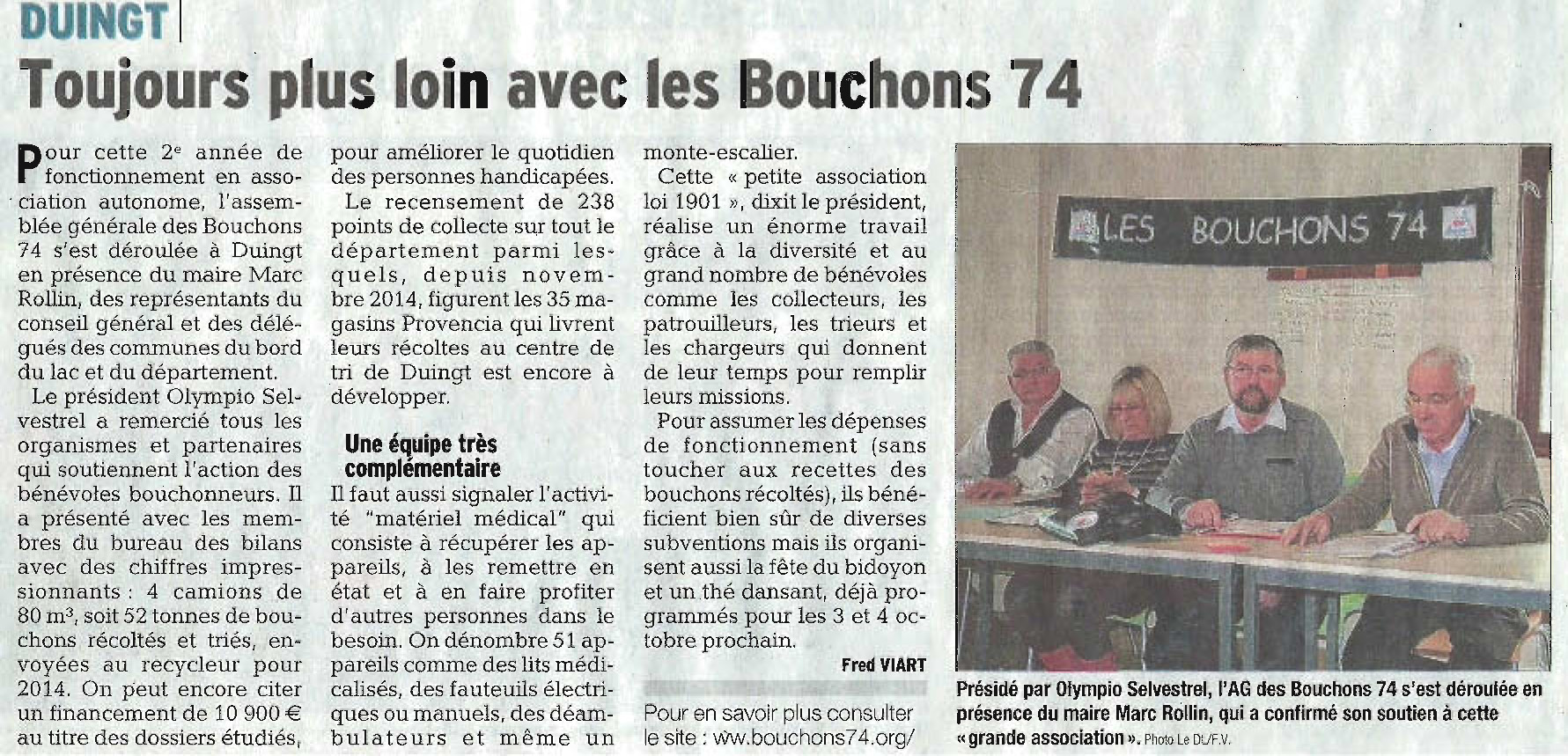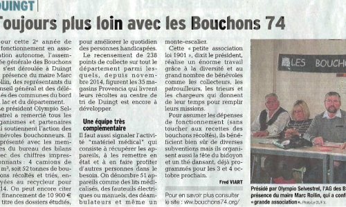 Article du Dauphiné Libéré en date du : 03/03/2015 ; DUINGT, Toujours plus loin avec Les Bouchons 74