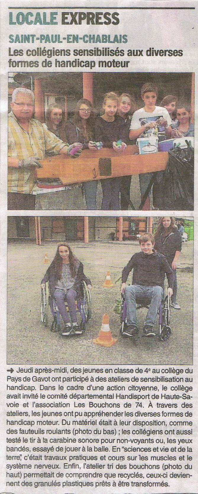 Article du Dauphiné Libéré en date du : 04/05/2015 ; SAINT-PAUL-EN-CHABLAIS : Les collégiens sensibilisés aux diverses formes de handicap moteur