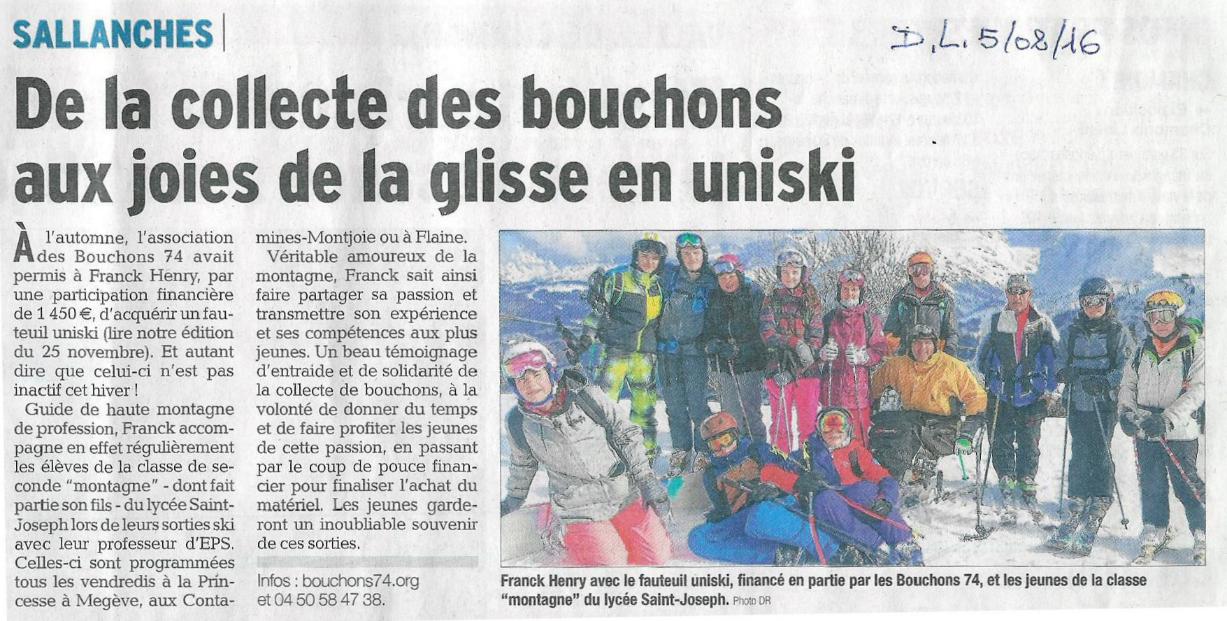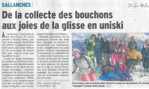 Article du Dauphiné Libéré en date du : 05/02/2016 ; SALLANCHES : De la collecte des bouchons aux joies de la glisse en uniski