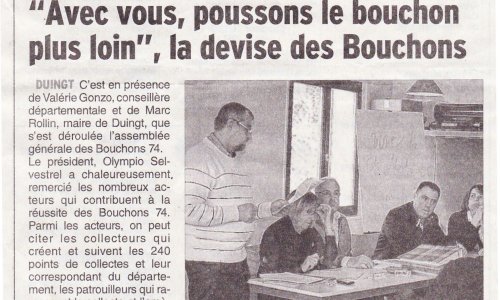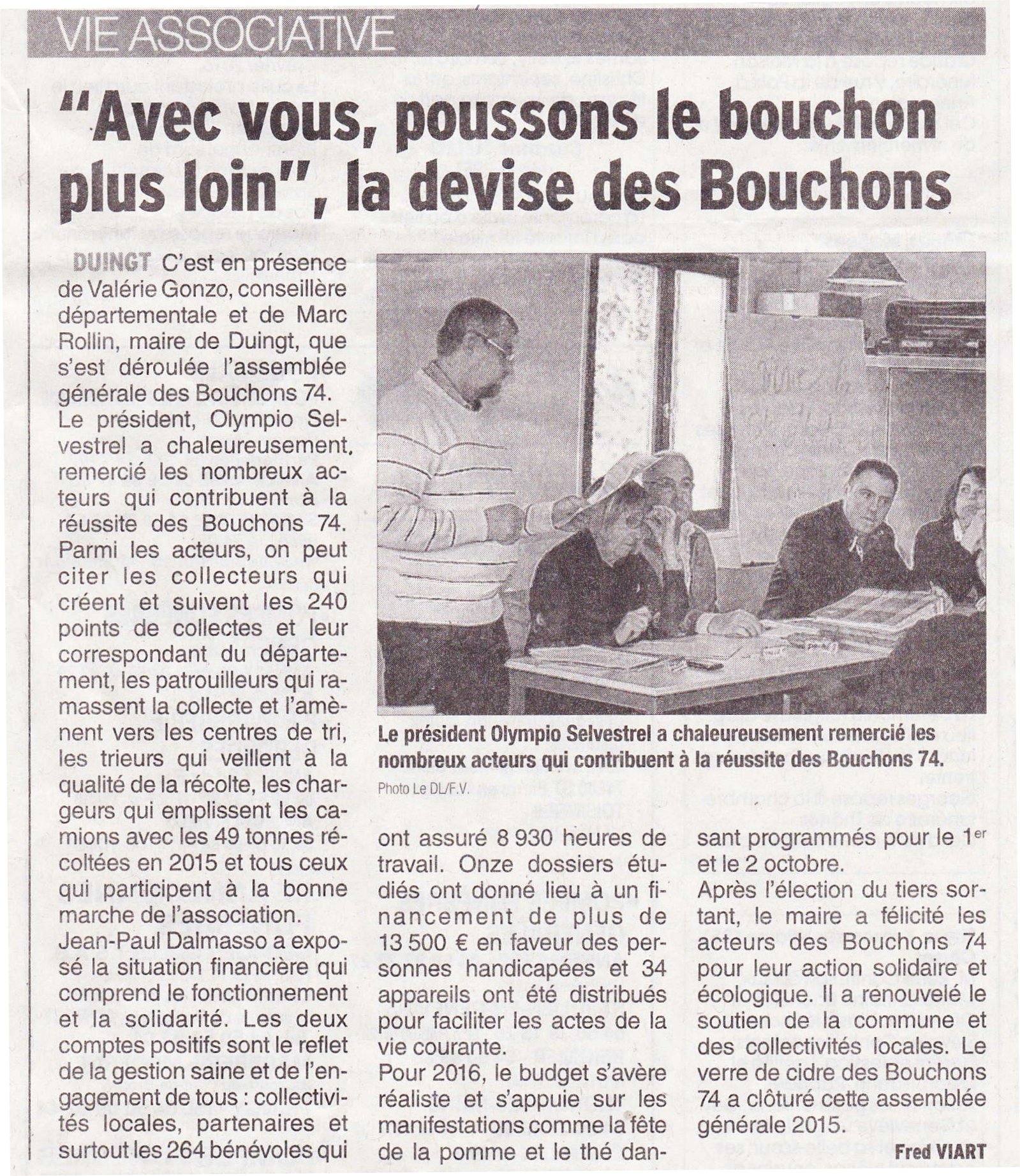 Article du Dauphiné Libéré en date du : 10/02/2016 ; Vie associative : Avec vous, poussons le bouchon un peu plus loin, devise des Bouchons 74
