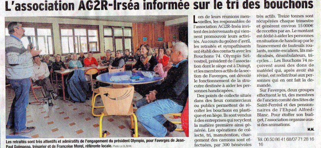 Article du Dauphiné Libéré en date du : 24/04/2016 ; L’association AG2R-Iséa informée sur le tri des bouchons