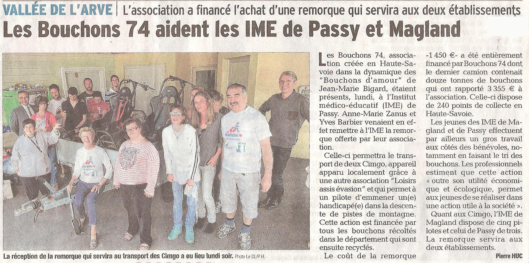 Article du Dauphiné Libéré en date du : 05/10/2016 ; VALLÉE DE L’ARVE ; Les Bouchons 74 aident les IME de Passy et Magland. L’association a financé l’achat d’une remarque qui servira aux deux établissements