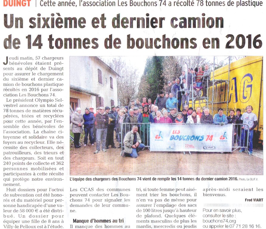 Article du Dauphiné Libéré en date du : 04/12/2016 ; DUINGT : Un sixième camion et dernier camion de 14 tonnes de bouchons en 2016. Cette année, l’association Les Bouchons 74 a récolté 78 tonnes de plastique
