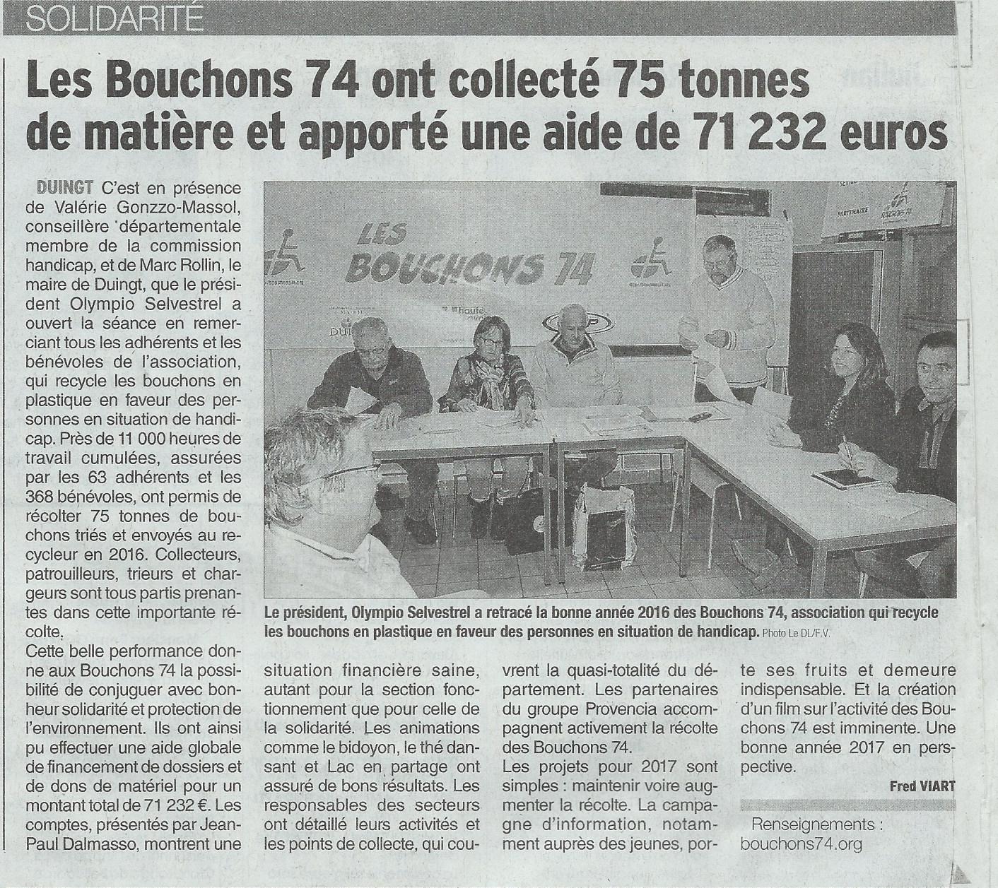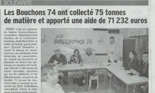 Article du Dauphiné Libéré en date du : 07/02/2017 ; Solidarité ; Les Bouchons 74 ont collecté 75 tonnes de matière et apporté une aide de 71 232 euros