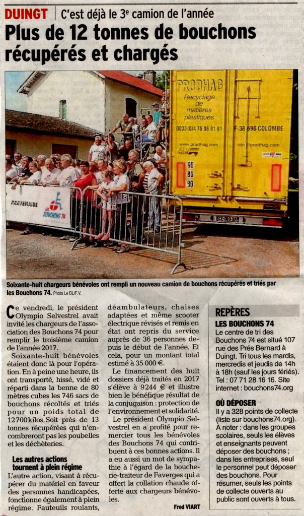 Article du Dauphiné Libéré en date du : 05/06/2017 ; DUINGT ; Plus de 12 tonnes de bouchons récupérés et chargés. C’est déjà le 3ème camion de l’année