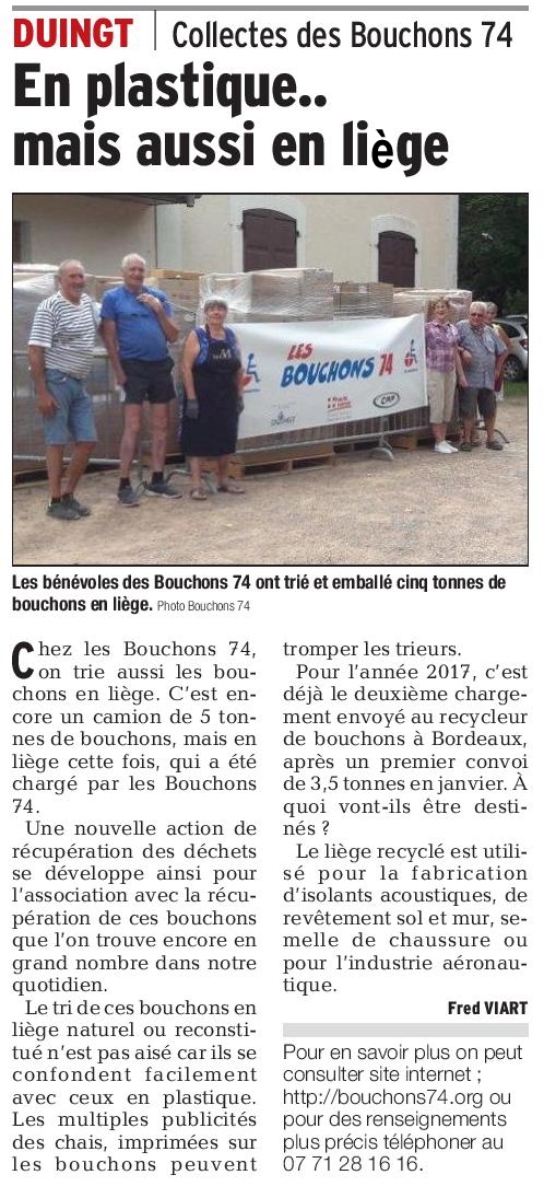 Article du Dauphiné Libéré en date du : 24/07/2017 ; DUINGT ; Collectes des Bouchons 74. En plastique..mais aussi en liège