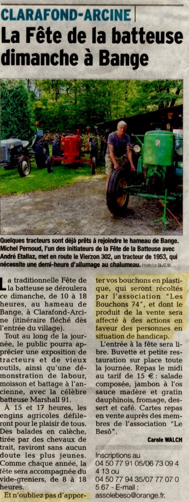 Article du Dauphiné Libéré en date du : 06/08/2017 ; CLARAFOND-ARCINE : La fête de la batteuse dimanche à Bange