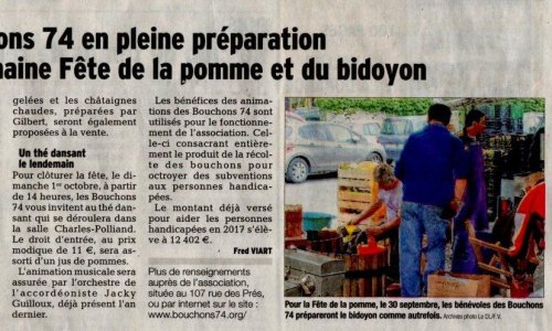 Article du Dauphiné Libéré en date du : 10/09/2017 ; DUINGT : Les Bouchons 74 en pleine préparation de la prochaine fête de la pomme et du bidoyon