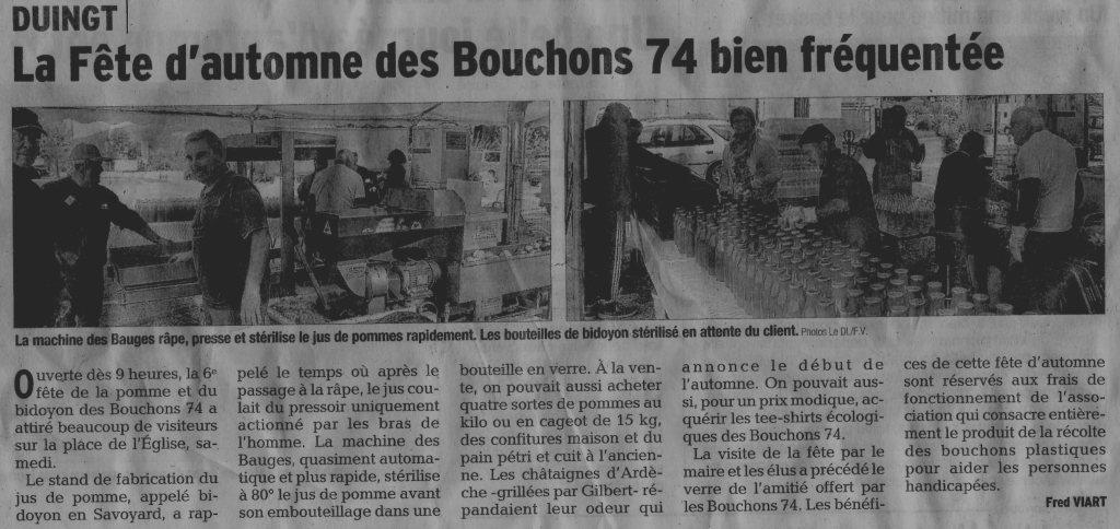 Article du Dauphiné Libéré en date du : 04/10/2017 ; la fête d’automne des Bouchons 74